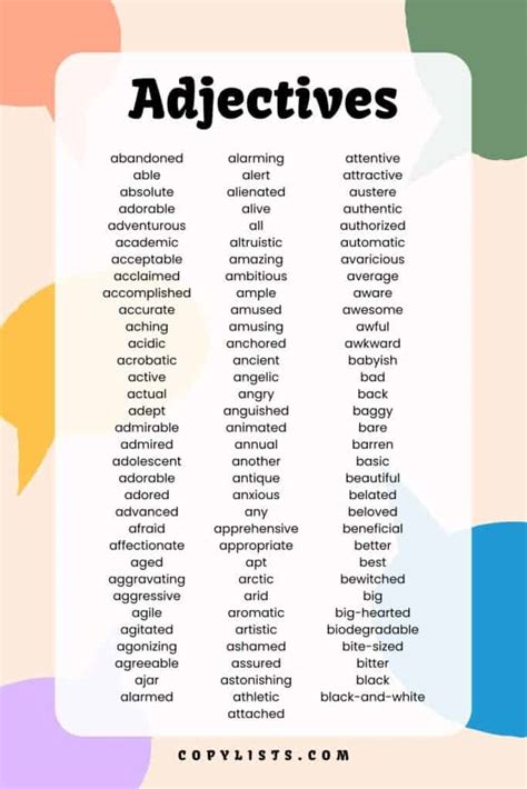 Descriptive adjectives are the most common type. These adjectives describe the qualities or characteristics of a noun. They answer the question, “What kind?” Examples include beautiful , tall , intelligent , happy , and delicious . For instance, in the sentence “She wore a beautiful dress,” the adjective “beautiful” describes the quality of the dress. Similarly, “He is an intelligent student” uses “intelligent” to describe the student’s characteristic. These adjectives add detail and make your descriptions more vivid. They allow you to paint a picture with words, helping your audience to visualize what you are describing. Using a variety of descriptive adjectives can make your writing more engaging and interesting. Don’t be afraid to get creative and use adjectives that truly capture the essence of what you are describing. The more descriptive your adjectives, the more impactful your writing will be.