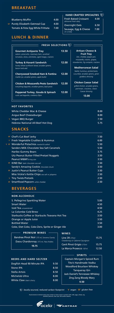 Now, let’s talk about the Cafe Car, which is accessible to all passengers, regardless of your ticket class. This is where you’ll find a more casual approach to the Amtrak Acela menu . Think of it as your onboard convenience store and bistro rolled into one. Here, you can grab a quick bite, a refreshing drink, or even a more substantial light meal. They typically offer a variety of sandwiches, salads, snacks like chips and cookies, and pastries. For breakfast, you might find items like muffins, yogurt parfaits, or breakfast sandwiches. Lunch and dinner options usually include sandwiches, wraps, and sometimes even a hot item like mac and cheese or a soup. Coffee, tea, soft drinks, and sometimes beer and wine are also available. It’s perfect for when you don’t want a full sit-down meal or if you’re traveling in Coach class and want to supplement your own snacks. The prices are, as you might expect, a bit higher than your average convenience store, but it’s a convenient option when you’re on the move. The selection can vary slightly depending on the route and the time of day, but you can generally count on finding satisfying options to keep hunger at bay. It’s a great spot to stretch your legs, grab a bite, and maybe even chat with other travelers. Don’t expect gourmet, but do expect convenience and a decent selection to tide you over between stations.