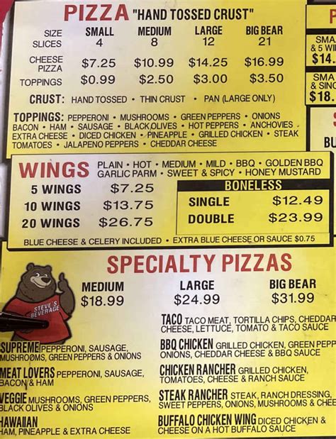 Who doesn’t love a good deal, right? Big Bear Pizza knows how to keep your wallet happy while satisfying your pizza cravings. They offer a variety of deals and specials that are hard to resist. First off, let’s talk about their lunch specials. During lunchtime, you can snag a slice of pizza with a side salad or a small order of wings at a discounted price. It’s the perfect way to fuel up without breaking the bank. Then there are their family deals , designed to feed a crowd. These usually include a large pizza with your choice of toppings, along with a side of garlic knots or a two-liter soda. Perfect for movie nights or game days! Keep an eye out for their weekly specials too. They often feature discounted prices on specific pizzas or combinations. For example, they might offer a discount on all vegetarian pizzas on Mondays or a special price on their “Big Bear Special” on Wednesdays. And don’t forget to sign up for their email list or follow them on social media. They frequently announce exclusive deals and promotions to their followers. Plus, they have a loyalty program where you can earn points for every purchase. Once you accumulate enough points, you can redeem them for free pizzas or other goodies. So, before you place your next order, make sure to check out their current deals and specials. You might just find a way to save some serious dough (pun intended!).
