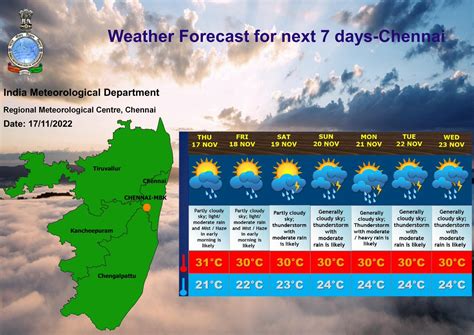 Okay, so you know what’s happening right now . But what about later today, tomorrow, or even next week? That’s where the Chennai weather forecast comes in! We’ll give you a detailed look at what you can expect, including high and low temperatures, the chance of rain, and any other relevant weather information. The forecast is based on the latest weather models, so you can be sure that it is up-to-date and accurate. The forecast will be provided for various time frames. This includes hourly forecasts, which are ideal for planning your activities throughout the day, as well as daily and weekly forecasts for longer-term planning. We’ll also provide information about any special weather alerts or warnings that may be in effect, such as heat advisories or severe thunderstorm watches. These alerts can help you stay safe and prepared for any potential weather hazards. Always stay informed about weather conditions and forecasts to plan your day. Remember that weather can change quickly. Always double-check the forecast before going outside. Additionally, it’s always a good idea to have a backup plan, just in case the weather doesn’t cooperate with your plans. Whether you’re planning a trip to the beach, a day of shopping, or simply staying at home, knowing the Chennai weather forecast is essential.