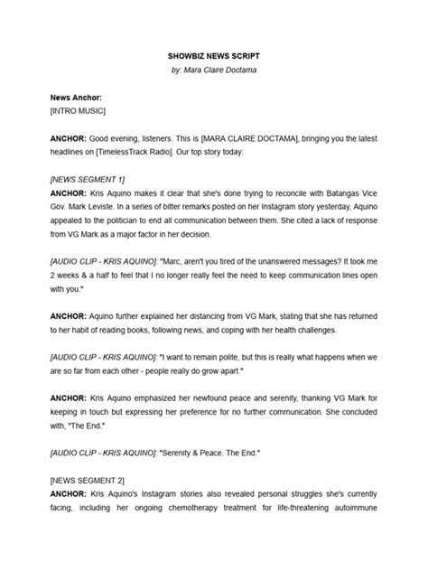 When you’re crafting Tagalog showbiz news scripts , the very first and arguably most crucial step is to meticulously research and select your story . This is where you dig for gold , identifying the most captivating and relevant topics that will truly resonate with your audience. You see, guys, the world of showbiz is a whirlwind of events, and not every little tidbit is news-worthy. Your job is to sift through the noise and find those narratives that spark interest, provoke discussion, or offer genuine insight into the lives of our beloved artista . Start by monitoring various sources: mainstream news outlets, celebrity gossip columns, social media (Twitter, Instagram, TikTok are goldmines!), fan pages, and even exclusive interviews. Look for emerging trends, ongoing controversies, significant achievements, or heartwarming personal stories that have captured public attention. Is there a new love team brewing? Did a celebrity just launch a new business venture? Is there an inspiring comeback story unfolding? These are the kinds of questions that guide your initial search. Once you have a potential story, the next critical phase is verification . In the age of misinformation, double-checking your facts is not just good practice, it’s absolutely essential for maintaining credibility. Don’t fall for unverified rumors or blind items without concrete evidence. Seek out multiple reliable sources to confirm details, dates, names, and quotes. If it’s a developing story, be transparent about what’s confirmed and what’s still speculative. Remember, your audience relies on you for accurate information, and a single factual error can significantly damage your reputation. Trust, once lost, is incredibly hard to regain. Finally, consider the angle of your story. How will you tell this story in a way that makes it unique and engaging? Will you focus on the human interest aspect, the financial implications, the fan reactions, or perhaps a broader industry trend? For example, a celebrity breakup could be reported as a simple factual announcement, or you could explore the impact on their respective careers, fan communities, or even offer expert commentary on public relationships. Choosing a fresh, compelling angle can elevate an ordinary piece of news into a truly memorable report. This step lays the entire foundation for your script, ensuring that you’re building on solid ground with a story that’s not only interesting but also accurate and thoughtfully presented to your eager kababayans . This meticulous approach to research and story selection ensures that the content you create is always of the highest quality, providing genuine value and captivating your audience from the very first word. It’s all about finding that perfect scoop and presenting it responsibly.