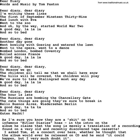 Hey everyone! Today, we’re diving deep into something super special: the lyrics of the song “Dear Diary.” You know, those words that just stick with you, paint a picture, and maybe even make you feel like you’re not alone. “Dear Diary” is one of those tracks that really hits home for a lot of people, and understanding the lyrics is key to unlocking its full emotional power. We’re going to break down what makes these lyrics so resonant, exploring the themes, the storytelling, and the raw emotion packed into every line. Get ready to get a little introspective with me, guys, because we’re about to unravel the magic behind “Dear Diary’s” lyrics .