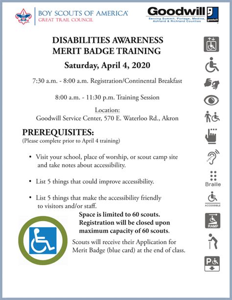 So, what are the nitty-gritty responsibilities? First off, you need to be a registered adult leader with the Boy Scouts of America and have completed Fast Start and Youth Protection training. Beyond the basic requirements, you need to genuinely understand the Disability Awareness Merit Badge pamphlet. It’s your roadmap! Read it, study it, and think about how you can make the information engaging and relevant for the Scouts. Your main job is to help Scouts understand the diversity of abilities and disabilities, the challenges people with disabilities face, and how to be an ally. This involves meeting with your Scouts, discussing the requirements, and approving their work. But don’t just sign off on things! Engage them in meaningful conversations. Ask them what they learned, how it changed their perspective, or what surprised them. Encourage them to think about how they can apply these lessons in their daily lives, both within and outside of Scouting. You’ll also be responsible for ensuring that any interactions Scouts have with individuals with disabilities are done in a respectful, appropriate, and pre-arranged manner. This is crucial for maintaining the dignity of all involved. It’s about quality over quantity here; it’s better for a Scout to have one truly meaningful interaction than several superficial ones. Your goal is to foster empathy, understanding, and a commitment to inclusion. You are the facilitator of their learning journey, helping them see the world through a more compassionate lens. This includes teaching them about different types of disabilities, the history of the disability rights movement, and the importance of accessibility. You’re not just teaching facts; you’re fostering a mindset shift towards greater acceptance and respect. Remember, your enthusiasm and genuine interest in the subject will be contagious and will significantly contribute to the Scouts’ learning experience. By fulfilling these responsibilities, you are not just helping Scouts earn a badge, but you are helping them become better, more informed, and more compassionate individuals, ready to embrace diversity and champion inclusion in all aspects of their lives.