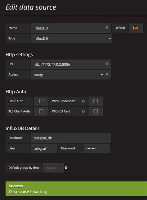 We’ve added the grafana service using the official grafana/grafana-oss:latest image. We expose port 3000, which is Grafana’s default web port. Similar to InfluxDB, we use a volume ( grafana_data ) to persist Grafana’s configuration and data. depends_on: - influxdb ensures InfluxDB is up before Grafana starts, although Grafana will retry connecting if the data source isn’t immediately available. After saving this updated docker-compose.yml , run docker-compose up -d . Once Grafana starts (give it a minute or two), you can access its web interface by navigating to http://localhost:3000 in your browser. The default login is usually admin for both username and password. You’ll be prompted to change it immediately. Now, inside Grafana, we need to add InfluxDB as a data source. Go to Configuration (the gear icon) -> Data Sources -> Add data source. Select InfluxDB. For the URL, use http://influxdb:8086 . Set the database to telegraf (the one we configured Telegraf to use). Enter the username admin and the password mypassword you set for InfluxDB. Save and test the connection. If it works, congratulations! You’ve successfully completed setting up InfluxDB, Telegraf, and Grafana with Docker ! Now you can start creating dashboards and visualizing all that juicy metric data.