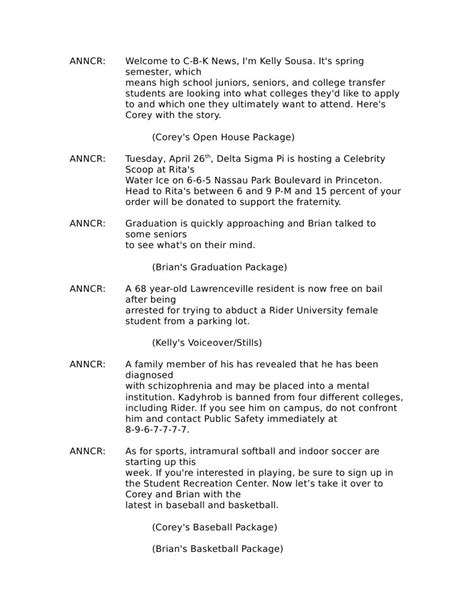 • Understanding News Format: By analyzing different scripts, you gain a better understanding of the standard news format. This includes the introduction, body, and conclusion of a news story, as well as the transitions between stories.