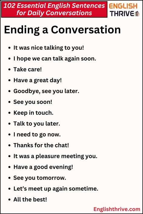 When you want to change the subject, you can use phrases like “By the way…” or “Speaking of…” For example, “By the way, did you see the game last night?” or “Speaking of movies, have you seen the new one?” To end the conversation politely, you can say “It was nice talking to you,” or “See you later,” or “Have a great day!”