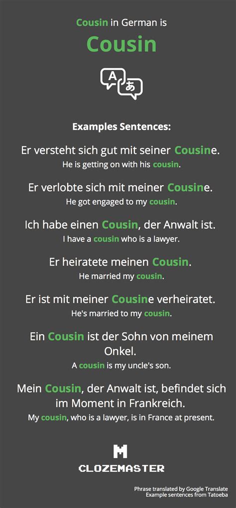 So there you have it, guys! We’ve journeyed through the German translations for “cousin,” uncovering der Cousin and die Cousine , their plural forms, and the sometimes-tricky possessive cases. We’ve seen how German grammar requires attention to gender and case, making it a bit more detailed than the English “cousin.” We also touched upon more specific terms and older variants, giving you a fuller picture of the language. And of course, we discussed how tools like Google Translate can help, but also where their limitations lie. The main takeaway? While translation tools are handy for a quick fix, true understanding and fluency come from learning the rules and practicing them. Whether you’re speaking with family, friends, or just exploring the German language, knowing these terms will definitely enhance your communication. Keep practicing those declensions, pay attention to gender, and don’t be afraid to try! Viel Erfolg (Good luck)!