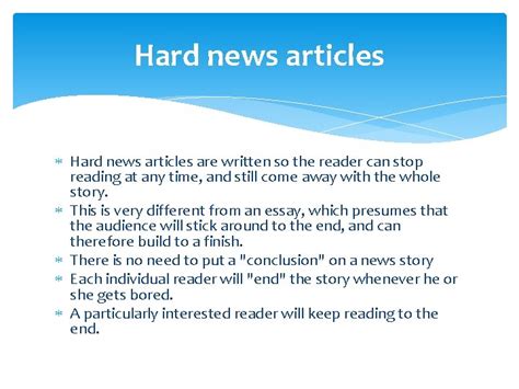 Impact refers to the significance of the event and its potential to affect a large number of people. Stories that have a wide-ranging impact, such as changes in government policy or major economic shifts, are considered hard news. Objectivity is a cornerstone of hard news. Reporters must present the facts without bias, avoiding personal opinions or emotional language. The goal is to provide a clear and impartial account of what happened. Prominence involves the importance of the people involved in the story. Events involving well-known figures, such as politicians, celebrities, or business leaders, are more likely to be considered hard news. Proximity refers to the location of the event and its relevance to the audience. Events that occur locally or have a direct impact on the local community are more likely to be covered as hard news. Conflict often drives hard news stories. This can include political disputes, legal battles, or military conflicts. Stories involving conflict tend to be more attention-grabbing and are therefore considered newsworthy. In addition to these elements, hard news articles also rely on credible sources. Reporters are expected to verify their information with multiple sources, such as official statements, expert interviews, and documented evidence. This helps to ensure the accuracy and reliability of the news. The structure of a hard news article typically follows the inverted pyramid style. The most important information is presented first, usually in the opening paragraphs, followed by supporting details in descending order of importance. This allows readers to quickly grasp the key facts, even if they don’t read the entire article. Overall, hard news articles are characterized by their focus on factual, objective reporting of significant events. By adhering to these key elements, journalists can provide readers with the information they need to stay informed and make informed decisions about the world around them. So, when you’re reading a news article, keep an eye out for these elements to determine whether it qualifies as hard news.