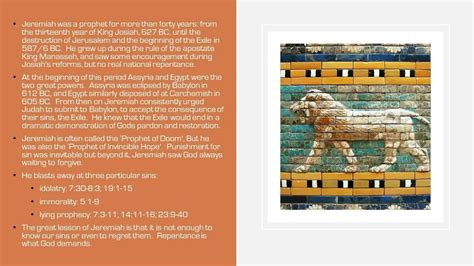 Understanding Jeremiah’s historical context is crucial. The kingdom of Judah was politically unstable, caught between the declining Assyrian Empire and the rising Babylonian Empire. Internally, things weren’t much better. Corruption, social injustice, and religious syncretism were rampant. Jeremiah’s prophecies were a direct challenge to these issues, calling for a return to the covenant with God. He faced constant opposition from the political and religious establishment, who didn’t want to hear his warnings. They preferred to maintain the status quo, even if it meant ignoring God’s commands. This resistance to change is a theme that resonates throughout the book and is highlighted in the BibleProject’s overview.