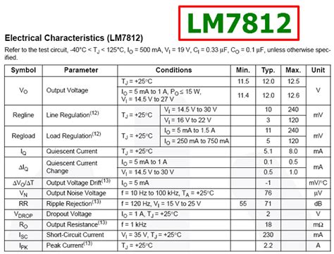 Electrical characteristics define how the LM7812 performs under different operating conditions. These characteristics are typically specified in the datasheet and are essential for designing a reliable power supply. Here are some key electrical characteristics: