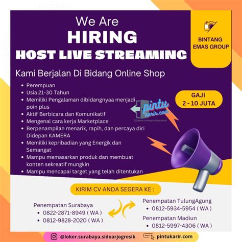 Hey, guys! Lagi nyari kerjaan sampingan yang asyik dan fleksibel di Jakarta? Terutama buat kalian yang suka ngobrol, berinteraksi, dan punya passion di dunia digital, loker host live part time Jakarta bisa jadi jawabannya nih. Profesi ini lagi hits banget, lho, dan menawarkan kesempatan buat kamu buat dapetin income tambahan sambil ngembangin skill komunikasi dan entertainment -mu. Jadi, kalau kamu tertarik buat jadi bagian dari dunia live streaming yang dinamis, yuk, kita bahas lebih dalam soal loker ini!