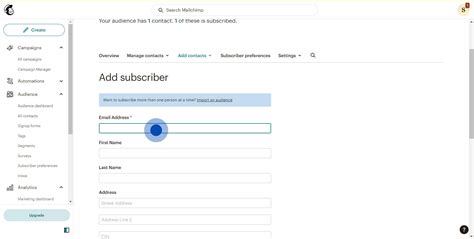 One of the simplest ways to add subscribers to Mailchimp is by manually adding them one by one. This method is ideal for adding a small number of subscribers, such as when you meet someone at a networking event or receive a business card. To manually add a subscriber, follow these steps: