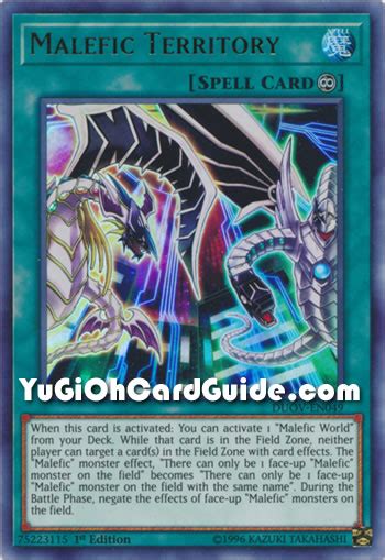 Let’s talk about Malefic Territory , because this card is absolutely essential for any Malefic World strategy. Seriously, guys, if you’re not running this, you’re probably not playing Malefic optimally. When you activate Malefic Territory, its first effect lets you search your entire deck for any Malefic monster and add it to your hand . Yes, you read that right. You can grab any Malefic monster you need, whether it’s a beatstick like Malefic Cyber End Dragon or a utility monster like Malefic Stardust Dragon. This search power alone makes it a cornerstone of the archetype, ensuring you always have access to the right monster for the situation. But it doesn’t stop there! Malefic Territory also provides a crucial defensive buff: your Malefic monsters cannot be destroyed by battle . This is a game-changer. It means that even if your opponent manages to summon a monster that can challenge your Malefic monsters in battle, your monsters will survive. They might not deal damage, but they won’t be destroyed. This significantly increases the survivability of your powerful Malefic monsters, allowing them to stay on the field and exert pressure for longer. The combination of searching capability and battle protection makes Malefic Territory the single most important card in a Malefic deck. It streamlines your summons, ensures you have the threats you need, and protects those threats from common forms of removal. It’s the engine that powers your Malefic strategy. Without it, you’d be relying on luck of the draw for your key monsters, and your powerful monsters would be vulnerable to every common monster removal effect. Malefic Territory is the glue that holds the entire archetype together, making it a consistent and formidable force on the dueling field. Make sure you have three copies in your deck, unless format restrictions say otherwise. It’s that important.