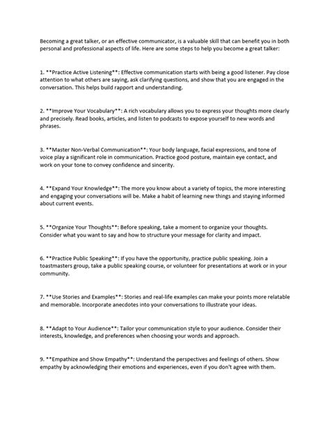 Now, let’s talk about the other half of the communication coin, which is arguably even more important: active listening . Guys, so many of us think communication is just about getting our own points across, but it’s a two-way street! Active listening isn’t just passively hearing words; it’s about fully concentrating on, understanding, responding to, and remembering what is being said. This means putting away distractions – yes, I’m looking at you, smartphones! – and giving the speaker your undivided attention. It involves more than just nodding; it’s about showing you’re engaged through body language like maintaining eye contact and leaning in slightly. When you actively listen, you’re not just waiting for your turn to talk; you’re trying to grasp the speaker’s perspective, their feelings, and the underlying message. This often involves paraphrasing what you’ve heard back to the speaker to confirm understanding. Phrases like, “So, if I’m hearing you correctly, you’re saying…” or “It sounds like you’re feeling…” can be incredibly powerful. It shows the speaker you’re truly invested in what they have to say and that you value their input. Another key aspect is asking clarifying questions . Instead of assuming you understand, probe gently to get more information. This not only helps you understand better but also encourages the speaker to elaborate and feel heard. Empathy plays a huge role here too. Try to put yourself in the speaker’s shoes and understand their emotional state. This can significantly improve the quality of the interaction and build stronger relationships. When you practice active listening, you reduce misunderstandings, resolve conflicts more effectively, and foster a sense of trust and respect. It’s a skill that takes practice, but the payoff in terms of stronger connections and more productive dialogue is immense. Don’t just hear; listen .
