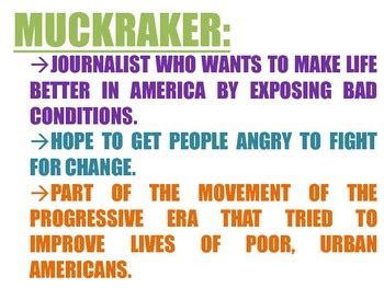 • Impact: Understand how muckrakers increased public awareness, inspired reform movements, and led to legislation.