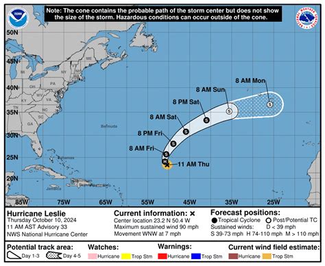 Now, let’s explore the Leslie tracker map . This is your real-time companion during hurricane season, providing crucial information about a specific storm. These maps are a visual representation of a hurricane’s current location, projected path, and intensity. They combine data from various sources to give you a comprehensive understanding of the storm’s potential impact. The map shows the storm’s current position, usually indicated by a symbol that represents the hurricane. It also displays the projected path of the storm, which is based on computer models and expert analysis. These models take into account various factors, such as wind patterns, sea surface temperatures, and the storm’s internal dynamics. While the projected path is an important tool, it is essential to remember that it is not a guarantee of the storm’s actual track. Hurricanes can change course due to unexpected changes in atmospheric conditions. The tracker map includes information about the storm’s intensity, usually represented by the category on the Saffir-Simpson Hurricane Wind Scale. The map also displays the wind speeds, which are critical in determining the potential damage from the storm. In addition to the storm’s path and intensity, the Leslie tracker map often includes other important information, such as the areas under hurricane watch and warning. These are issued by the National Weather Service and indicate the potential for dangerous conditions. The map may also show the expected arrival times of tropical storm-force winds and hurricane-force winds in specific areas. Understanding how to read and interpret the information on a Leslie tracker map is essential for staying informed during a hurricane. Use it as a key resource in monitoring the storm’s progress and making informed decisions about your safety. Always be sure to consult official sources for the most up-to-date information and guidance.
