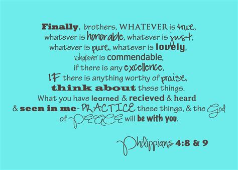 “Finally, brothers and sisters, whatever is true, whatever is noble, whatever is right, whatever is pure, whatever is lovely, whatever is admirable—if anything is excellent or praiseworthy—think about such things. Whatever you have learned or received or heard from me or seen in me—put it into practice. And the God of peace will be with you.”