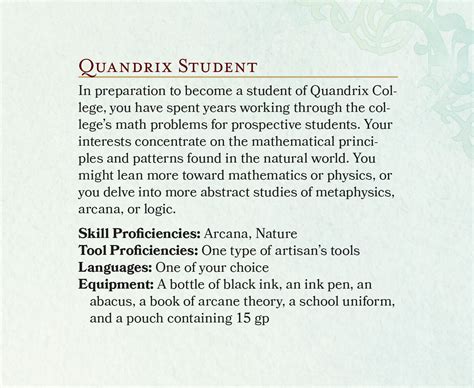 • Develop Your Character’s Personality: A Quandrix student 5e character can be incredibly fascinating, so use this chance to build a character with a unique personality. Think about their approach to problem-solving, their intellectual curiosity, and their relationships with other characters. Do they have a mentor? Are they fascinated by a particular mathematical concept? The choices you make will make your character engaging and memorable.