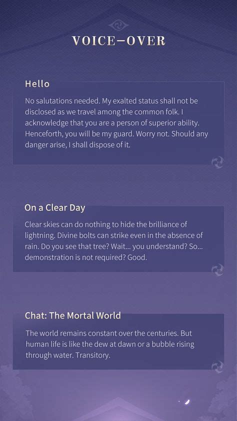 These voice lines provide insights into the Raiden Shogun’s self-perception and her views on her own existence. They often touch upon her pursuit of eternity and her role as the Electro Archon. These lines are fundamental to understanding her core beliefs and motivations.