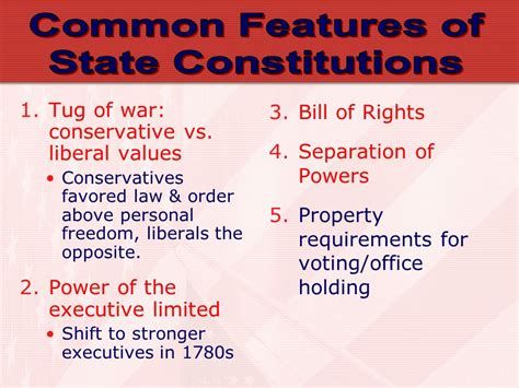 Another significant feature was the separation of powers. Inspired by Enlightenment thinkers like Montesquieu, the state constitutions generally divided governmental authority among the legislative, executive, and judicial branches. This division of power was designed to prevent any one branch from becoming too powerful, preventing the tyranny that the colonists so feared from the British monarchy. The legislative branch, typically composed of a legislature, was responsible for making laws. The executive branch, usually headed by a governor, was tasked with enforcing the laws. The judicial branch, made up of courts, interpreted the laws. This separation of powers, coupled with checks and balances, was intended to safeguard against abuses of power. It’s a foundational concept that continues to shape American governance today. This principle is extremely important, so make sure you understand how each branch of government functioned in the state constitutions .