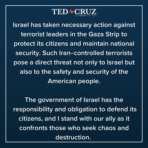 Furthermore, Senator Cruz has been a vocal opponent of the Boycott, Divestment, and Sanctions (BDS) movement. He views BDS as a discriminatory and anti-Semitic campaign aimed at isolating and delegitimizing the State of Israel. To counter this, he has supported and co-sponsored legislation designed to prevent BDS activities, particularly on college campuses and within governmental or corporate spheres. This includes efforts to ensure that taxpayer funds are not used to promote boycotts against Israel and to protect businesses that engage with Israel from discriminatory practices. His office has also been active in highlighting instances of anti-Israel sentiment and advocating for policies that support academic and economic freedom for those who engage with Israel.