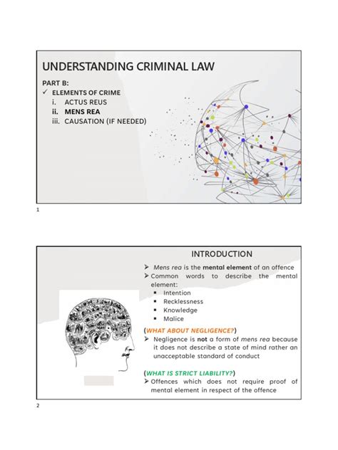• Mens Rea (Guilty Mind): This Latin term refers to the mental state of the defendant at the time they committed the crime. To be convicted, the defendant must have had the intent to commit the crime, or at least acted recklessly or negligently. Mens rea is a fundamental element of criminal law that distinguishes between accidental or unintentional acts and those committed with criminal intent. There are different levels of mens rea , ranging from purposeful intent to recklessness or negligence, and the specific level required varies depending on the crime.