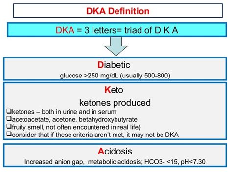Alright, guys, let’s unpack what DKA really means on a medical level. Diabetic Ketoacidosis, or DKA, is primarily associated with Type 1 diabetes , although it can sometimes occur in people with Type 2 diabetes under certain stressful conditions. The core issue here is a severe lack of insulin . Insulin is that magical hormone that acts like a key, unlocking your cells so that glucose from your bloodstream can get inside and be used for energy. When there isn’t enough insulin – either because you’re not producing it (like in Type 1 diabetes) or because your body isn’t responding to it effectively – the glucose can’t get into your cells. Your body, being the resilient machine it is, tries to find an alternative fuel source. That’s where it turns to fat . The breakdown of fat releases byproducts called ketones . Now, a small amount of ketones is normal, but in DKA, this process goes into overdrive. Your liver churns out ketones at an alarming rate, and they start to accumulate in your blood. This buildup makes your blood significantly more acidic . The medical term for this is acidosis . So, DKA is essentially a state where you have high blood sugar, high levels of ketones, and metabolic acidosis. It’s a trifecta of problems that can rapidly lead to serious health issues if not treated promptly. The medical definition emphasizes these three key components: hyperglycemia (high blood sugar), ketosis (ketone buildup), and acidosis (acidic blood).